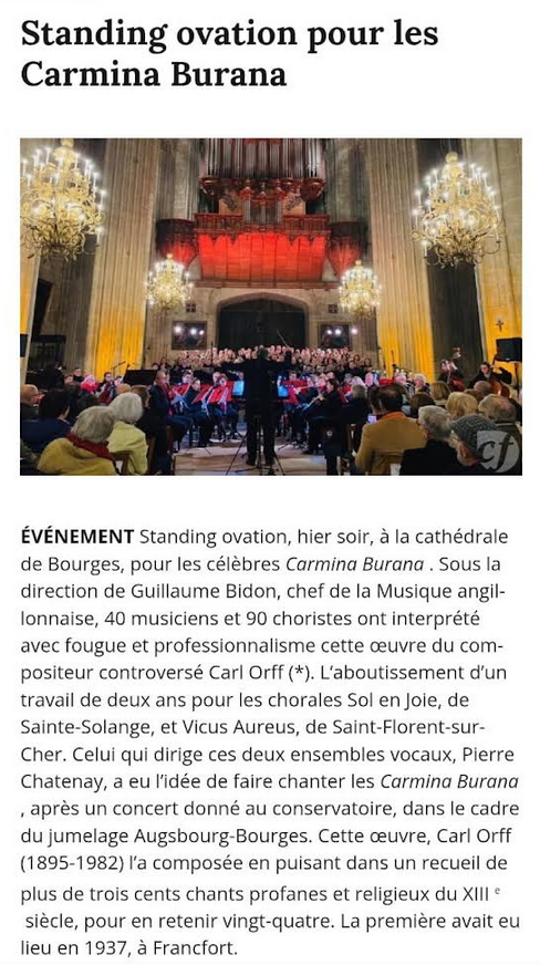 Un projet ambitieux réunit à l’horizon 2025 les chœurs Sol en Joie et Vicus Aureus ainsi que l’orchestre d’harmonie des Aix d’Angillon autour de l’une des œuvres les plus célèbres de la musique vocale : Carmina Burana.